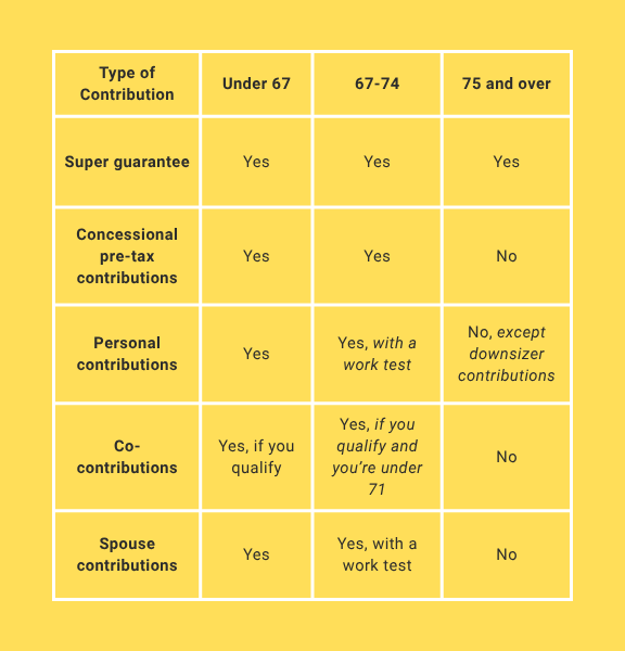 Here is a simple explanation of super contributions. Just refer to the table below for specific details and read further for a longer explanation under the age group that relates to you.